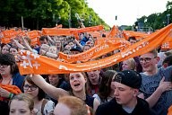 Visitors of the Kirchentag gathering at Alexanderplatz in central Berlin.