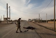 Syria ROJAVA / Dec16 - Jan17. Mahmudli Village. An arabe SDF soldier is walking on an ISIS dead body.