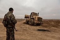 Syria ROJAVA / Dec16 - Jan17. A YPG Soldier is standing up next to the bulldozer not far from Mahmudli Village. The vehicule is building the protection for the basement.