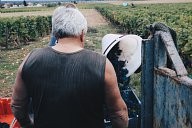 A harvester in his selected line in the wine yard.