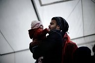 Young father with crying baby in the UNHCR tent in Chios island.