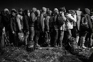 Refugees and migrants queue in front of the sorting center set up by the prefecture on the first day of the dismantling of the jungle slum. October 24, 2016. Calais. France.