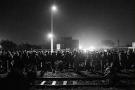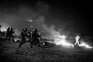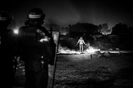 Police forces monitor the slum the day before the dismantling of the Jungle. Some garbage fires have been lit by some refugees and migrants. The police are hunting migrants and refugees from the land where the lights are on. October 24, 2016. Calais. France.