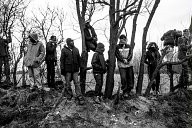 Two groups of refugees meet near the first access of the Channel Tunnel. November 01, 2015. Calais. France.