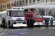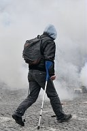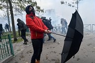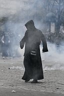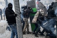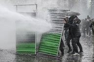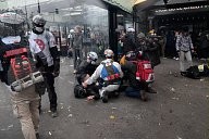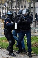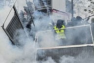 a firefighter caught in tear gas defends himself against a protester. Many yellow vests rallies took place this Saturday, November 16, 2019 for the 1st anniversary of the yellow vests.
