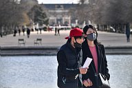 Rare tourists dressed in ffp2 masks, come to admire the Eiffel Tower, despite the epidemic of the new Coronavirus, Covid 19.