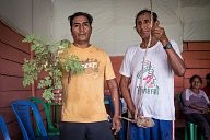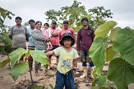 Two inhabitants of "point A8", a village where about fifty families of miners or ex-miners from La Pampa live, present a moringa plant (moringa oleifera) that they would like to cultivate. This tree from tropical countries is often praised for its nutritional and medicinal virtues. Most of the inhabitants would like to participate in the reforestation of the Tambopata reserve or diversify their agriculture.