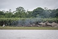 The Marines discovered this barge with miners working on it just before the arrival of the military. The ore, pumped from the bottom of the excavation, is washed and sieved on a mat to concentrate the gold. before being plunged into large drums containing liquid mercury that amalgamates the gold flakes. A large quantity of mercury - between 3 to 50g of mercury to obtain 1g of gold - is needed. Most of it is then disposed of in the excavation with the other mining waste. The water takes on a "chocolate" color, a sign of high mercury concentration.