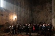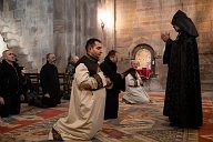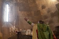 Armenia - Gandzasar Monastery - Armenian Christmas - Father Sahak raises his arms to heaven, towards the light, with his back to his faithful.