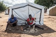 Camp de déplacés Deslocados de 25 junho / Deux déplacés sont assis devant la tente de Médecins Sans Frontières (MSF) - l'ONG, très présente depuis 2019, s'occupe des urgences, et de beaucoup de structures à l'intérieur des camps, comme l'eau, les maisons, les sanitaires, etc.
