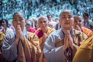 September 17, 2016: At the end of the initiation session, a monk does not hesitate to go and greet the Dalai Lama. Strasbourg (67), France.