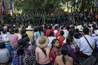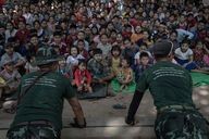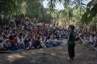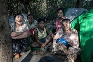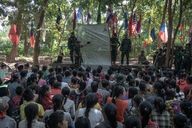 The FBR are sheltering hundreds of displaced people in hidden, secure locations, just a few kilometers from the front line and the Burmese army. These people are homeless, wounded and bruised. The FBR perform for them, distribute food and money.