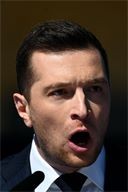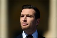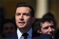Jordan Bardella speaks at the rally in support of Marine Le Pen, at Place Vauban, in Paris, on April 6, 2025.