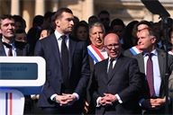 Jordan Bardella alongside UDR MP Eric Ciotti during the rally in support of Marine Le Pen, on Place Vauban, in Paris, on April 6, 2025.