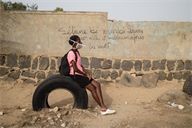 A young woman sits with a Sudanese flag flying over her head during a gathering of graffiti artists and artists on 4 February 2025 on the island of Ngor in Dakar in support of oppressed peoples and ongoing conflicts in Sudan, Congo, Haiti, Western Sahara, Afghanistan and Palestine. On the eve of Tabaski, the African Artists Against Apartheid (AAAA), RBS CREW, RBS AKADEMYA and Senegal.For.Palestine collectives created a large-scale fresco on June 4, 2025 on Dakar's Ile d'Ngor in support of oppressed peoples, with the aim of raising Senegalese awareness of the ongoing conflicts in Sudan, Congo, Haiti, Western Sahara and Palestine.