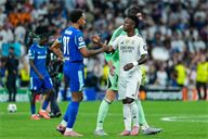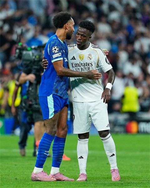 Vinicius Junior of Real Madrid CF and Pierre-Emerick Aubameyang of Olympique de Marseille congrats at the end of the match during the UEFA Champions League match between Real Madrid CF and Olimpique Marsella, on September 16, 2025