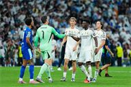 Thibaut Courtois and Aurelien Tchouameni of Real Madrid CF congrats at the end of the match during the UEFA Champions League match between Real Madrid CF and Olimpique Marsella, on September 16, 2025