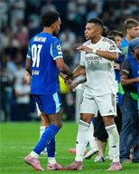 Kylian Mbappe of Real Madrid CF and Pierre-Emerick Aubameyang of Olympique de Marseille congrats at the end of the match during the UEFA Champions League match between Real Madrid CF and Olimpique Marsella, on September 16, 2025