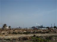 View of the Tunisian Chemical Group (GCT) plant from Gabes beach. The plant is a Tunisian state-owned company that produces and processes phosphate extracted from the Gafsa region into chemical products such as fertilizer and phosphoric acid. Exporting 90% of its production, the group is the main economic driver of the region and employs over 3,000 people on site. Farmers in the oasis face severe soil and air pollution due to toxic and polluting discharges into the air and sea. The plant releases 13,000 tons of dry phosphogypsum into the Mediterranean Sea every day.