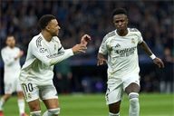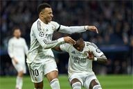 Vinicius Junior of Real Madrid CF celebrates his goal with Kylian Mbappe of Real Madrid CF during the UEFA Champions League match between Real Madrid CF and AS Monaco FC at Bernabeu stadium on January 20, 2026.