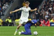 Daniel Mesonero of Real Madrid CF battles for the ball with Lucas Michal of AS Monaco FC during the UEFA Champions League match between Real Madrid CF and AS Monaco FC at Bernabeu stadium on January 20, 2026.
