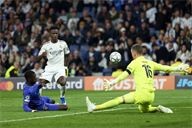 Vinicius Junior of Real Madrid CF battles for the ball with Philipp Kohn of AS Monaco FC during the UEFA Champions League match between Real Madrid CF and AS Monaco FC at Bernabeu stadium on January 20, 2026.