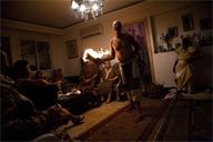 Riadh is in a trance with the spirit of Sidi Abdelsalem, in a family home in La Marsa, an affluent suburb of Tunis. This spirit always appears at the beginning of the ceremony. He is one of the most important Muslim saints in the ritual and among the host of spirits that Riadh invokes. With fire, he blesses the devotees and foretells their future, offering them guidance. He circles in the sacred space where the musicians perform.