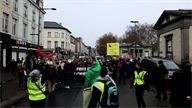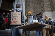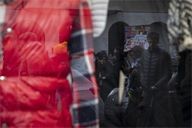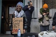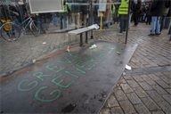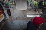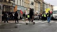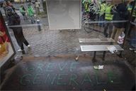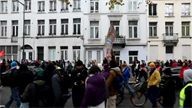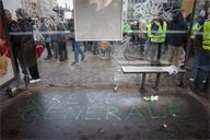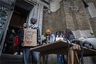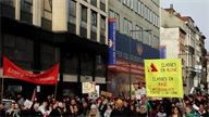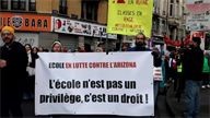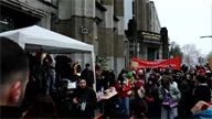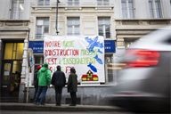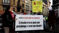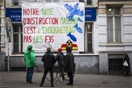 People look at a protest banner in front of a school. In the context of a three-day national general strike in Belgium, on the second day the civil service took action before the culture sector took its turn on the third day.