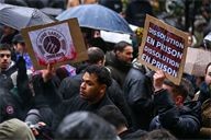 Activists hold up placards demanding the dissolution of the Young Guard.