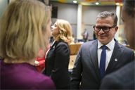 Andrej Babiš (L) Antonio Costa (C) Kaja Kallas (R). Round table discussion between European heads of state during the extraordinary summit in the Belgian capital.