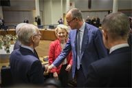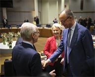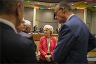 Ursula Von Der Leyen (C) Friedrich Merz (R) Luc Frieden (L). Round table discussion between European heads of state during the extraordinary summit in the Belgian capital.
