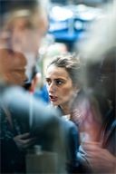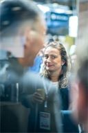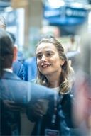 Portrait of Marine Tondelier surrounded by people during her visit to the 2025 Mayors' Fair. 19 November 2025. Paris, France.