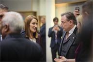 Roberta Metsola (L) Bart de Wever (C) Kaja Kallas (R) in conversation. Round table discussion between European heads of state during the extraordinary summit in the Belgian capital.