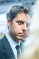 Portrait of Gabriel Attal looking questioning, former Prime Minister under Emmanuel Macron and Member of Parliament for Hauts-de-Seine, President of the Ensemble pour la RƩpublique group in the National Assembly. 19 November 2025. Paris, France.