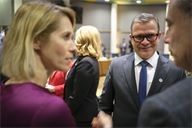 Petteri Orpo (C) in conversation with Kaja Kallas (L) and Bart de Wever (R). Round table discussion between European heads of state at the extraordinary summit in the Belgian capital.