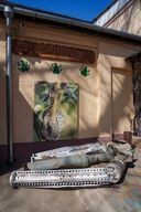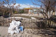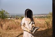 A beekeeper with his bee smoker works on hives located on a wooded hillside in Bamako, Mali, on November 8, 2023. He makes a variety of natural honeys, depending on the season.