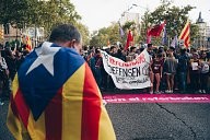 During the demonstration a man is crossing the crow with his flag, 22/09/17 Barcelone.