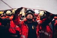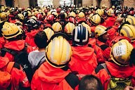 Demonstration of Firefighters - bombers- at the museum of historia of catalunya, Firefighters are preparing the banner that is hanged from the top of the museum, 28/09/17 barcelone.