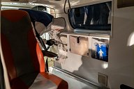 Two paramedics in protective suits take care of a COVID-19 suspect patient in an ambulance