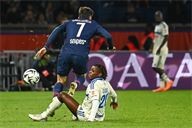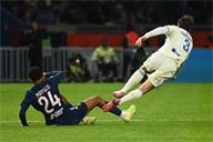 Foul by Senny Mayulu (M) during the 8th Day of Ligue 1 Mc Donald's, between PSG and RC Strasbourg Alsace at Parc des Princes, October 17, 2025