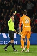 Referee Clement Turpin gives a yellow card to Strasbourg goalkeeper Mike Penders #39 during the 8th Day of Ligue 1 Mc Donald's, between PSG and RC Strasbourg Alsace at Parc des Princes, October 17, 2025