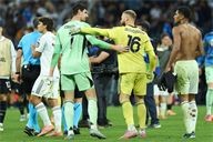 Thibaut Courtois of Real Madrid CF and Michele Di Gregorio of Juventus FC during the UEFA Champions League match between Real Madrid CF and Juventus FC at the Santiago Bernabeu Stadium, on 22 October 2025.