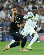 Weston Mckennie of Juventus FC battles for the ball with Eduardo Camavinga of Real Madrid CF during the UEFA Champions League match between Real Madrid CF and Juventus FC at the Santiago Bernabeu Stadium, on 22 October 2025.