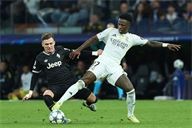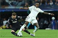 Vinicius Junior of Real Madrid CF battles for the ball with Lloyd Kelly of Juventus FC during the UEFA Champions League match between Real Madrid CF and Juventus FC at the Santiago Bernabeu Stadium, on 22 October 2025.