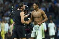 Aurelien Tchouameni and Alvaro Carreras of Real Madrid CF during the UEFA Champions League match between Real Madrid CF and Juventus FC at the Santiago Bernabeu Stadium, on 22 October 2025.