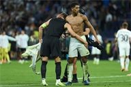 Jude Bellingham and Alvaro Carreras of Real Madrid CF during the UEFA Champions League match between Real Madrid CF and Juventus FC at the Santiago Bernabeu Stadium, on 22 October 2025.