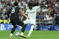 Vinicius Junior of Real Madrid CF battles for the ball with Francisco Conceicao of Juventus FC during the UEFA Champions League match between Real Madrid CF and Juventus FC at the Santiago Bernabeu Stadium, on 22 October 2025.