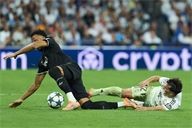 Kylian Mbappe of Real Madrid CF battles for the ball with Federico Gatti of Juventus FC during the UEFA Champions League match between Real Madrid CF and Juventus FC at the Santiago Bernabeu Stadium, on 22 October 2025.