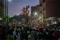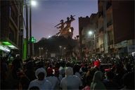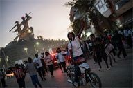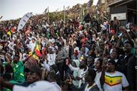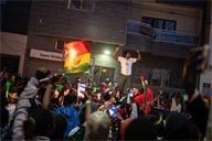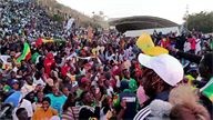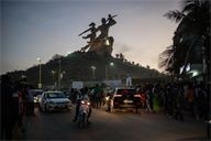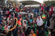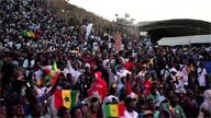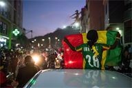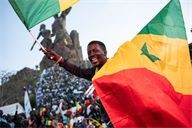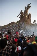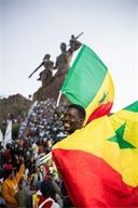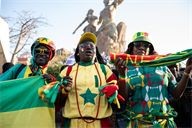 Supporters celebrate Senegal's victory over Egypt in the semi-finals of the Africa Cup of Nations on 14 January 2026 in the fan zone set up at the Renaissance Monument in Dakar, Senegal.