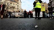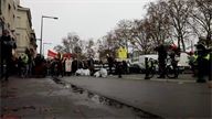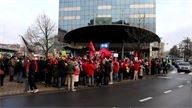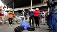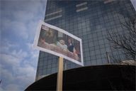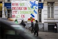 People look at a protest banner in front of a school. In the context of a three-day national general strike in Belgium, on the second day the civil service took action before the culture sector took its turn on the third day.